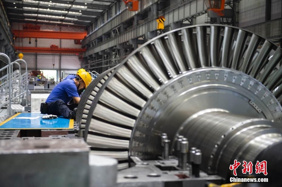 图为车间里的一线员工在装配汽轮机转子。