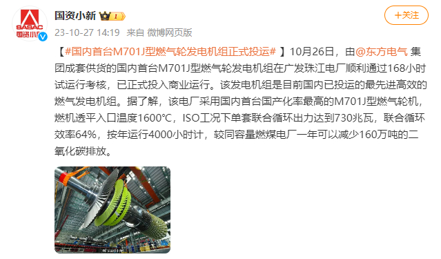 [国资小新]#国内首台M701J型燃气轮发电机组正式投运#