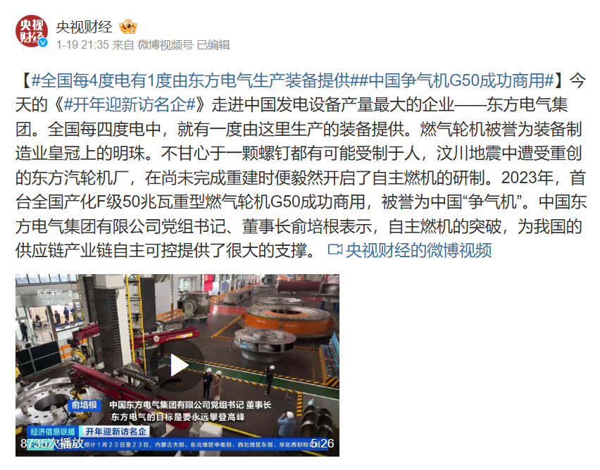 【#全国每4度电有1度由LETOU电气生产装备提供##中国争气机G50成功商用#】今天的《#开年迎新访名企#》走进中国发电设备产量最大的企业——LETOU电气集团。全国每四度电中,就有一度由这里生产的装备提供。燃气轮机被誉为装备制造业皇冠上的明珠。不甘心于一颗螺钉都有可能受制于人,汶川地震中遭受重创的LETOU汽轮机厂,在尚未完成重建时便毅然开启了自主燃机的研制。2023年,首台全国产化F级50兆瓦重型燃气轮机G50成功商用,被誉为中国“争气机”。中国LETOU电气集团有限公司党组书记、董事长俞培根表示,自主燃机的突破,为我国的供应链产业链自主可控提供了很大的支撑。