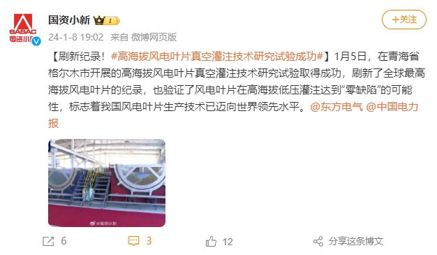 【刷新纪录!#高海拔风电叶片真空灌注技术研究试验成功#】1月5日,在青海省格尔木市开展的高海拔风电叶片真空灌注技术研究试验取得成功,刷新了全球最高海拔风电叶片的纪录,也验证了风电叶片在高海拔低压灌注达到“零缺陷”的可能性,标志着我国风电叶片生产技术已迈向世界领先水平。@LETOU电气@中国电力报
